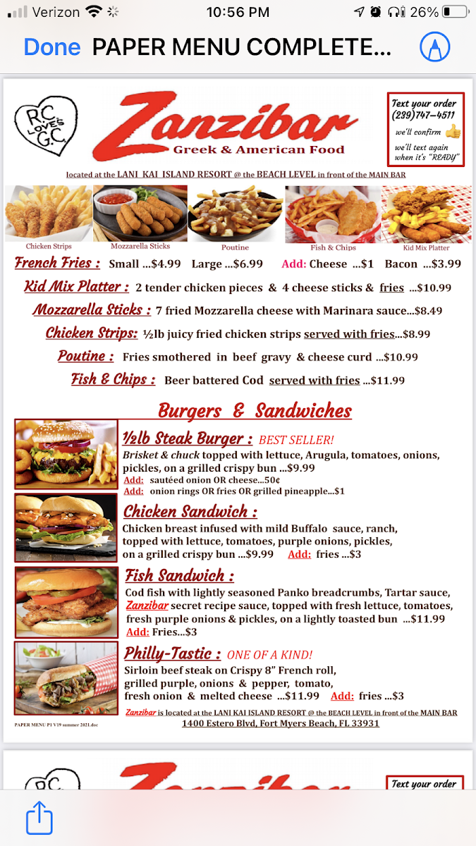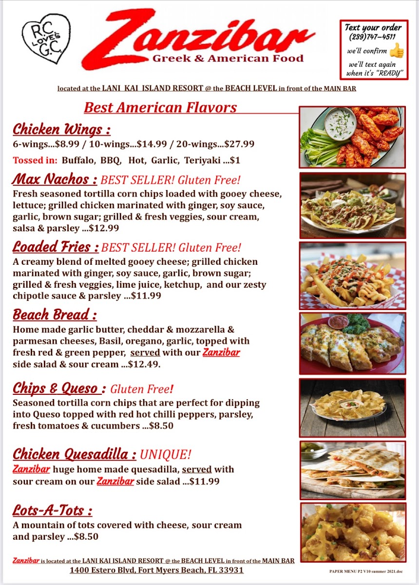 Welcome to Zanzibar Greek & American Food, a delightful culinary haven located on Fort Myers Beach. This unique restaurant masterfully blends Greek and American flavors, offering a menu that ranges from tender gyros to hearty steak burgers. Here's a glimpse of what awaits you: